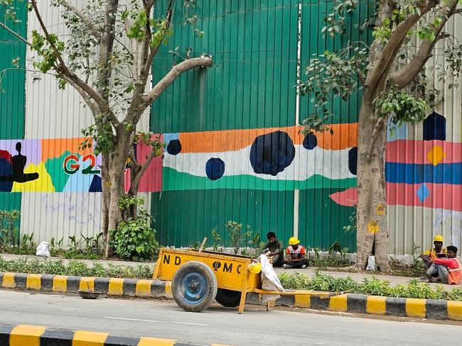 A smell that I am familiar with hung in the air of Delhi as I made my way across the city, past the shiny silver globs of steel that dot the green island opposite the All India Institute of Medical Sciences in South Delhi. I had photographed these just a few days before, at night, when suddenly their base sprouted a water fountain, after years of being surrounded by a green carpet of grass. It was noon when I next encountered them on the eve of the G20 summit. This time the sun was directly above my head and the flyover loop that I was negotiating had contract workers, some barefoot, swiftly applying paint on the protective traffic barriers of the lanes.