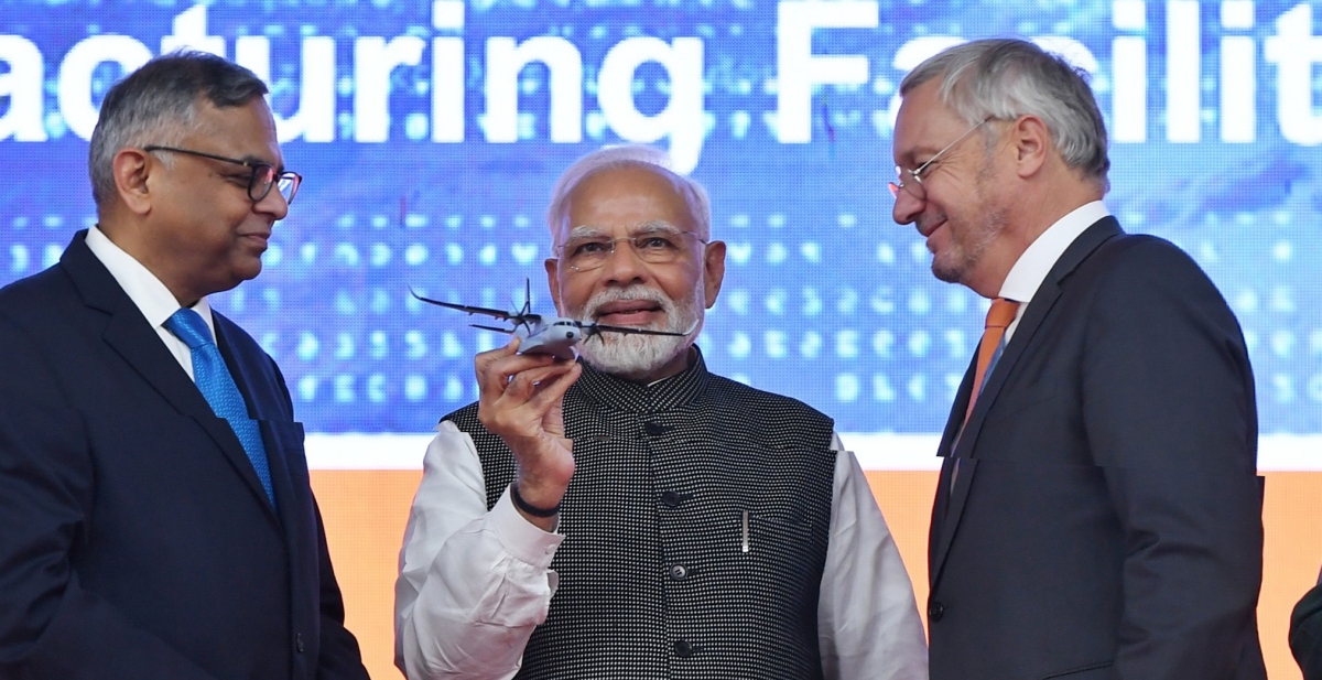 Prime Minister Narendra Modi holds a miniature model of the C-295 transport aircraft at the foundation laying stone of the Airbus-Tata consortium's manufacturing plant in Vadodara, Gujarat, October 30, 2022. Photo: pmindia.gov.in