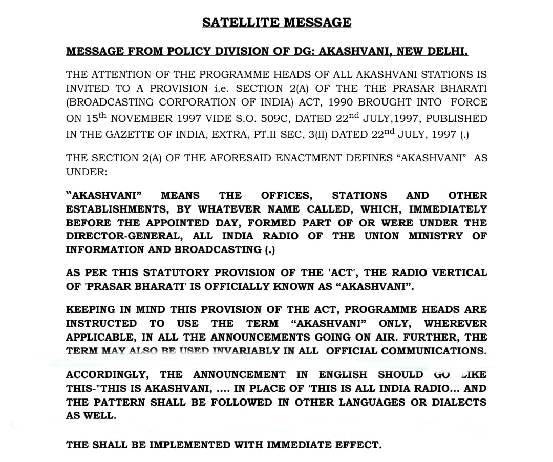 So now, per the message from headquarters, the new announcement pattern will be followed in other languages or dialects as well. So AIR may be broadcast in 179 tongues, but the radio vertical will still have a Hindi nomenclature.