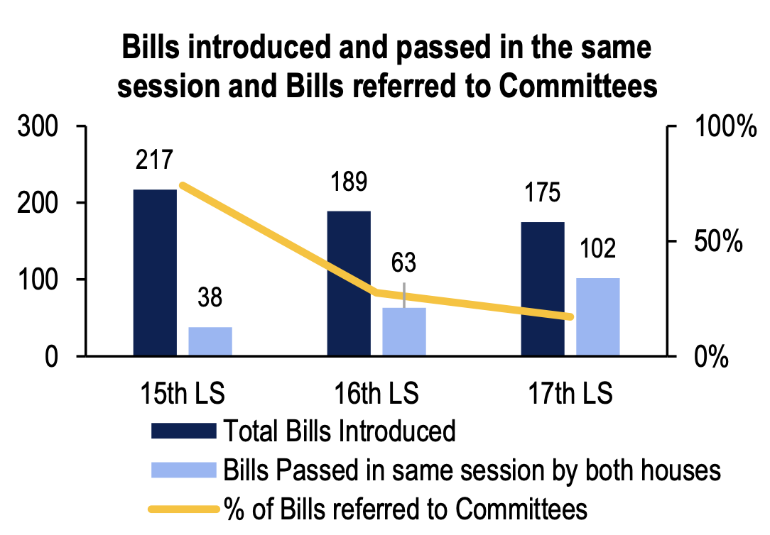- Out of 25 Bills introduced, three have been referred to committees. In this Lok Sabha, so far, 17% Bills have been referred to Committees. This is lower as compared to the last three Lok Sabhas. Of the 23 Bills passed in this session, seven have been examined by Standing Committees.