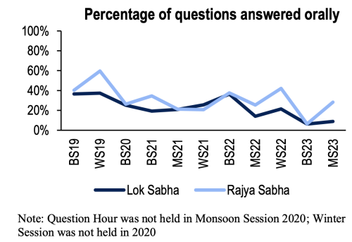 - In this session, 9% of questions listed for oral responses were answered in Lok Sabha, and 28% in Rajya Sabha. When Ministers answer questions orally in the House, members have the opportunity to ask supplementary questions and elicit further information.