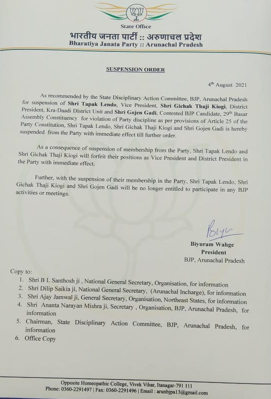 This past August 4, aside from Gojen Gadi, two other BJP leaders were suspended from the party, including Tapak Lendo, the state BJP vice president. Lendo’s post was given to one of the leaders who filed the FIR against Kipa – Tarh Tarak, seen close to the chief minister. Sources in the state unit of the BJP told The Wire that those suspended from the party were also being seen as part of the “Rijiju camp.”
