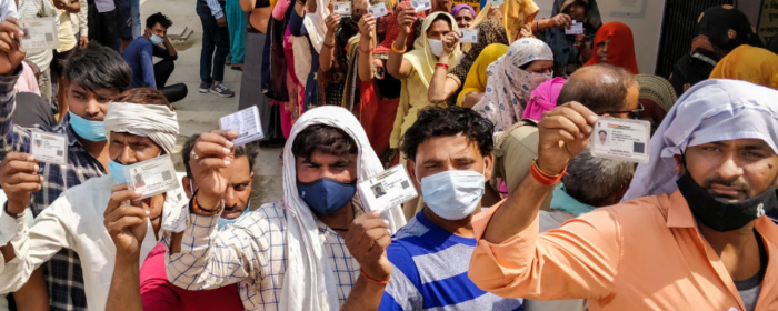 People show their voter ID as they stand in a queue to cast their vote for the Uttar Pradesh Gram Panchayat election, in Agra, Thursday, April 15, 2021. Photo: PTI