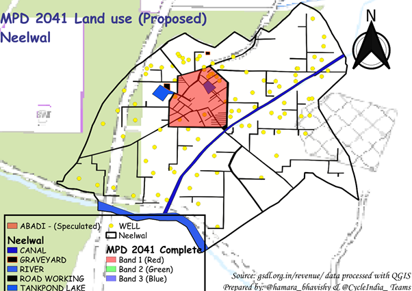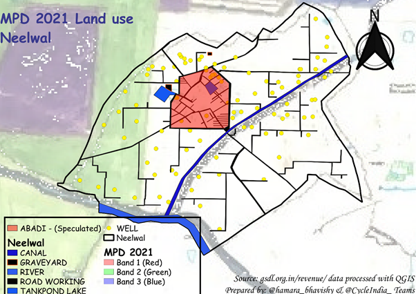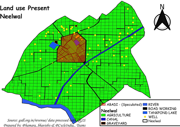 This photo is provided by the authors. Existing land use map of Neelwal village Khasra boundary. The core residential Abadi area of the village is surrounded by agricultural fields on all sides including a large canal system and no tube wells.