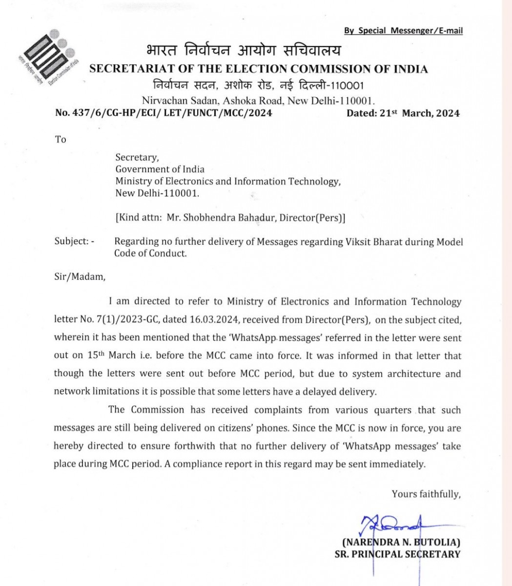 “The Commission has received complaints from various quarters that such messages are still being delivered on citizens' phones. Since the MCC is now in force, you are hereby directed to ensure forthwith that no further delivery of 'WhatsApp messages' take place during MCC period. A compliance report in this regard may be sent immediately.”