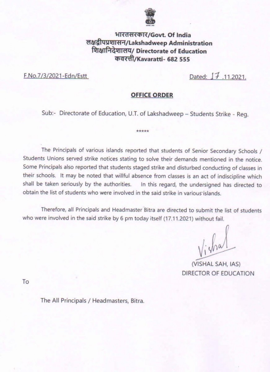 On November 17, the director of the education department issued a bizarre notice to the school principals in Lakshadweep. The notice, issued by Vishal Sah IAS, sought details of the students who attended a recent protest demanding reinstatement of educational scholarships, restoration of study tours, and appointment in vacant teaching posts.