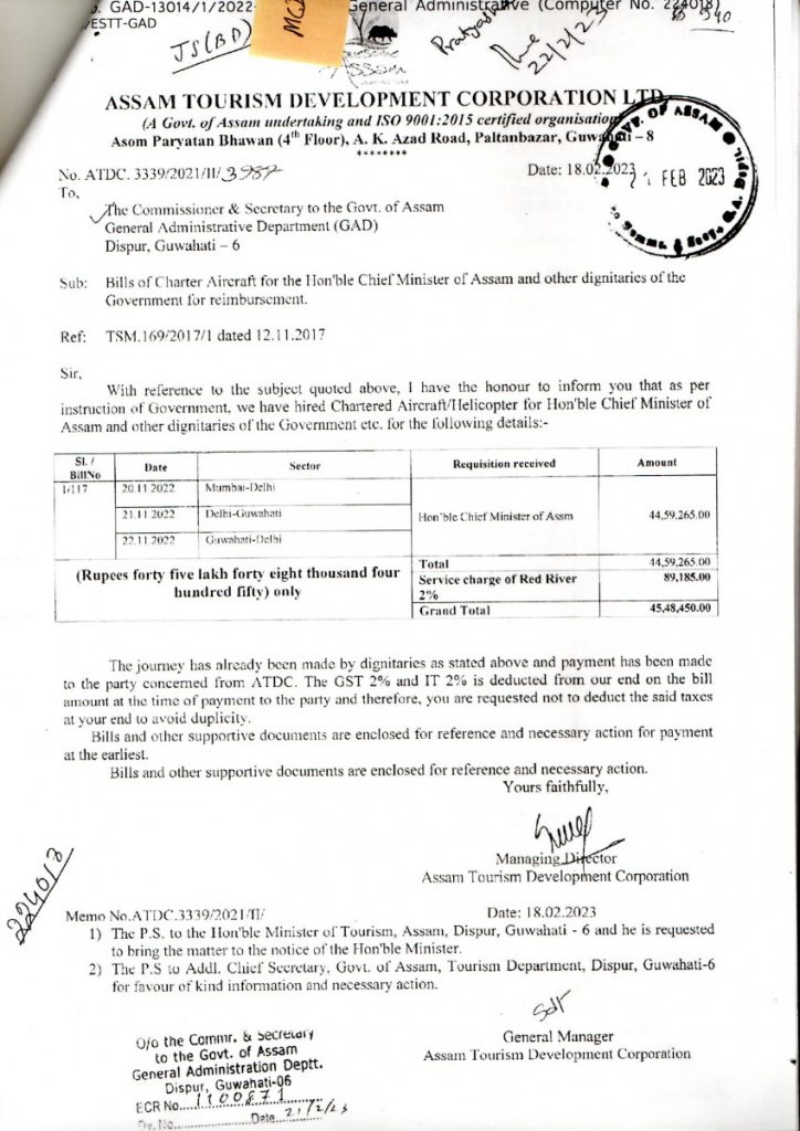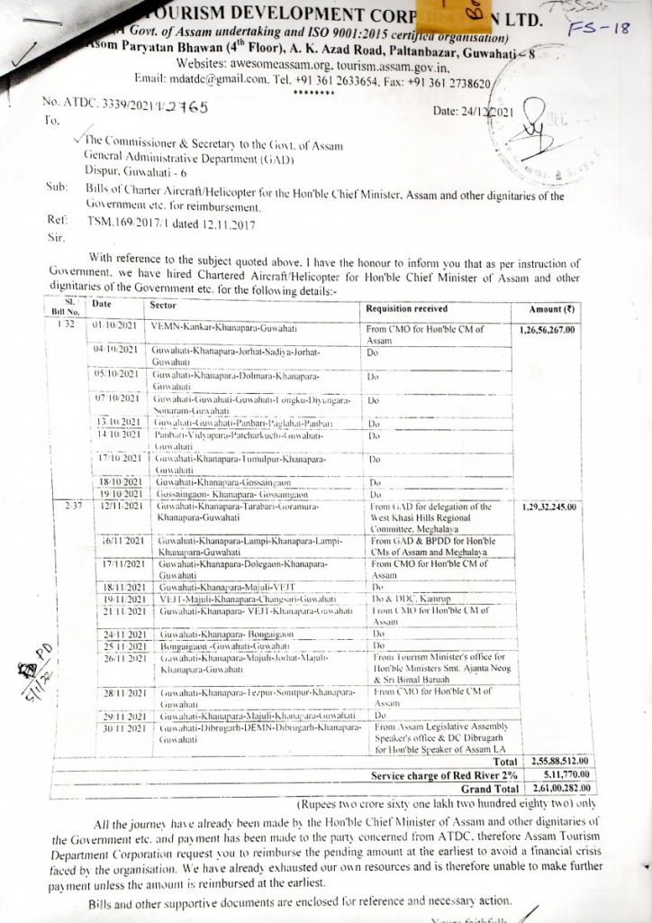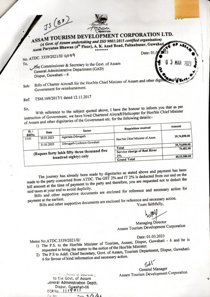 For instance, the Assam Tourism Development Corporation (ATDC), through which an order to charter a special flight is placed by the state government, had placed a bill of Rs 1,26,56,267 spent on the chief minister’s special flights to the general administration department on December 24, 2023.