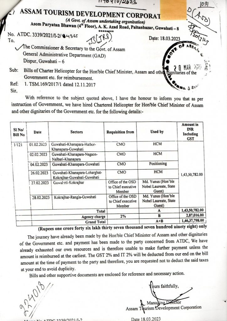As per the bill attached with the RTI replies, the chief minister flew to Tamulpur on October 17, 2023 and to Gossaigaon on October 18-19, 2023.