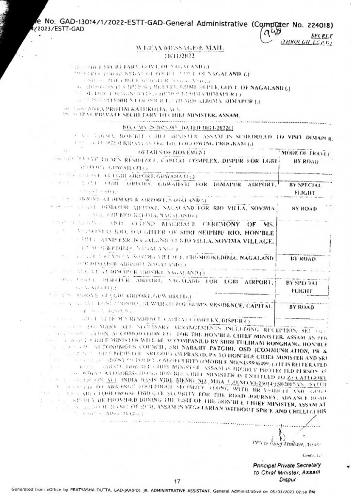 What needs highlighting here is also this: as per a bill (no. 1/119) submitted by the ATDC on February 17, 2023, the chief minister flew by a special flight from Guwahati to Dimapur and back on November 11, 2022 at a cost of Rs 14,08,562.