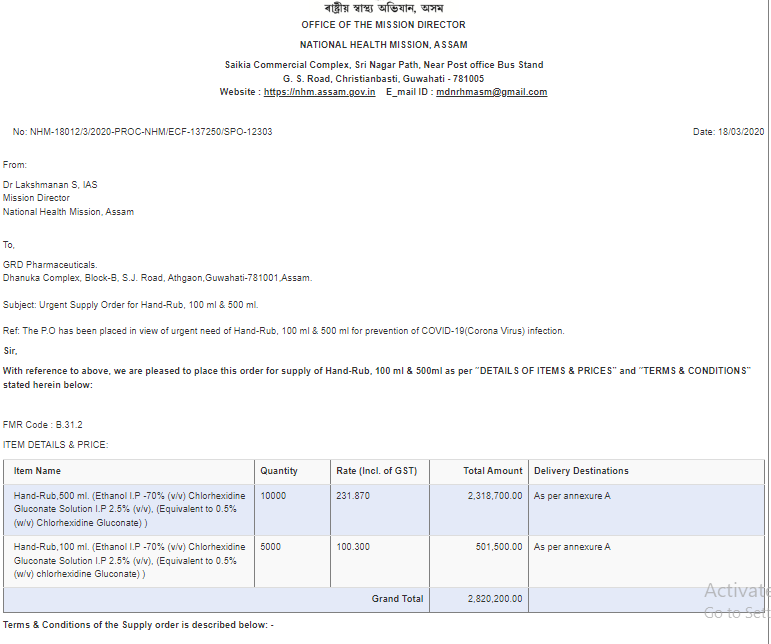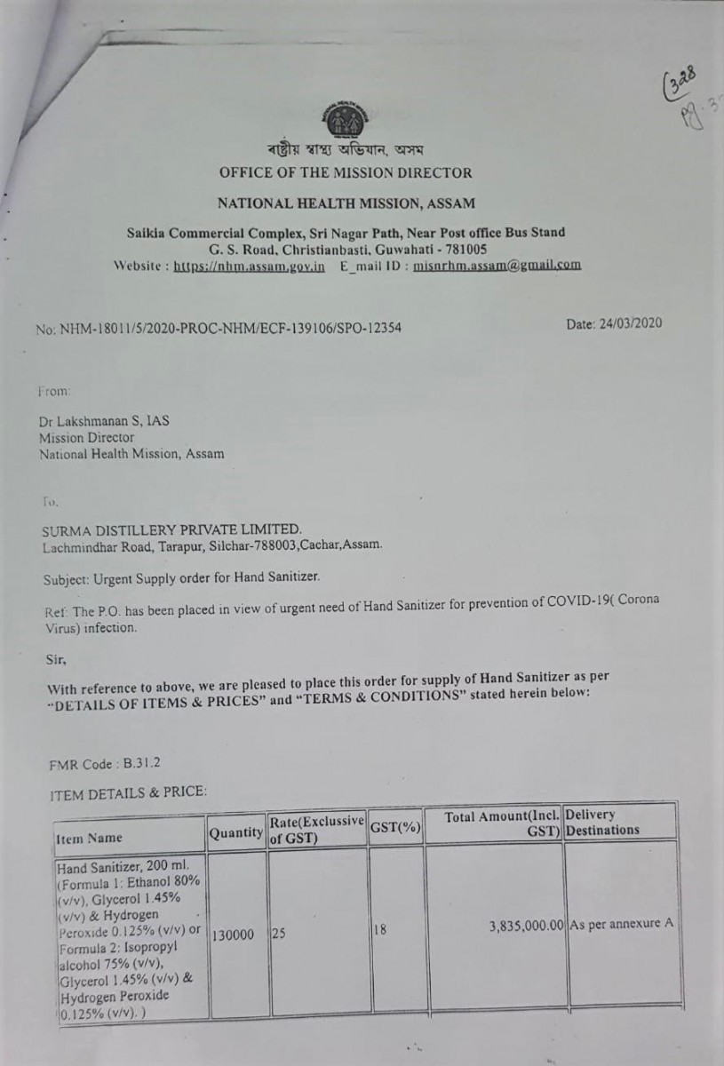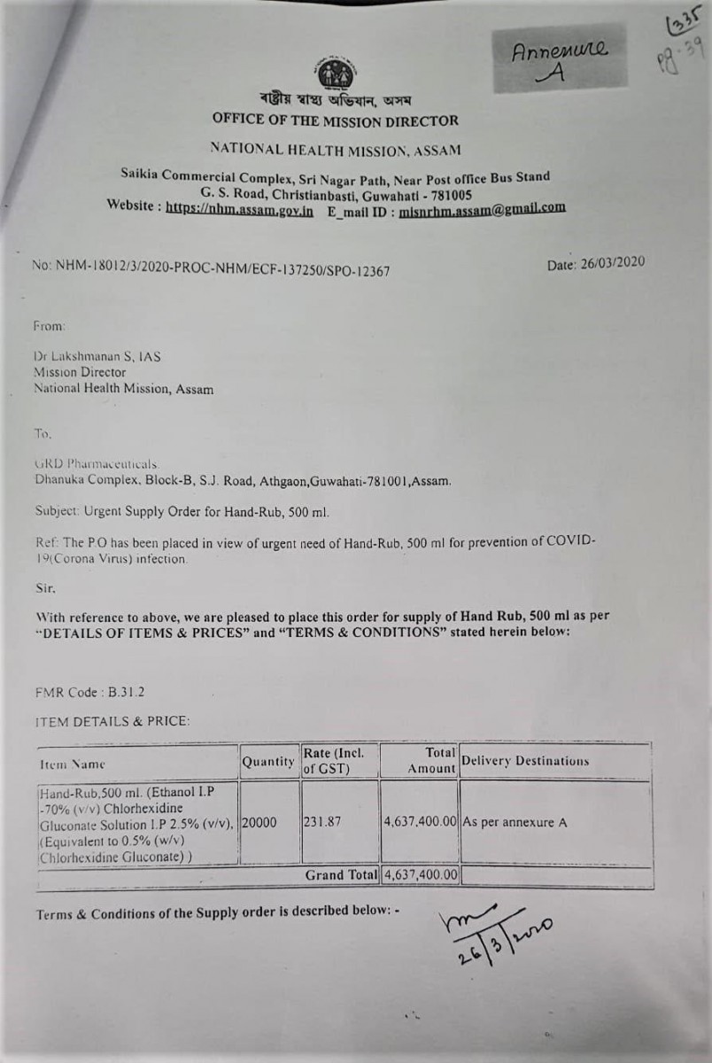 But what is to be underlined here is that on March 24, 2020 – hours before the sudden lockdown was announced by Prime Minister Narendra Modi – the NHM could successfully place an ‘urgent work order’ to another Assam-based firm, Surma Distillery Private Limited, to supply 1,30,000 hand sanitisers of 200 ml each. However, this was at a rate much lower than what NHM had agreed to pay GRD Pharmaceuticals.