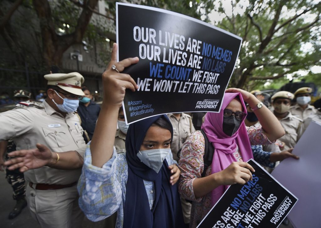 Activists hold placards during a protest after visuals of Thursday's violence during an eviction drive in Darrang district of Assam emerged in social media, in New Delhi, September 24, 2021. Photo: PTI/Manvender Vashist