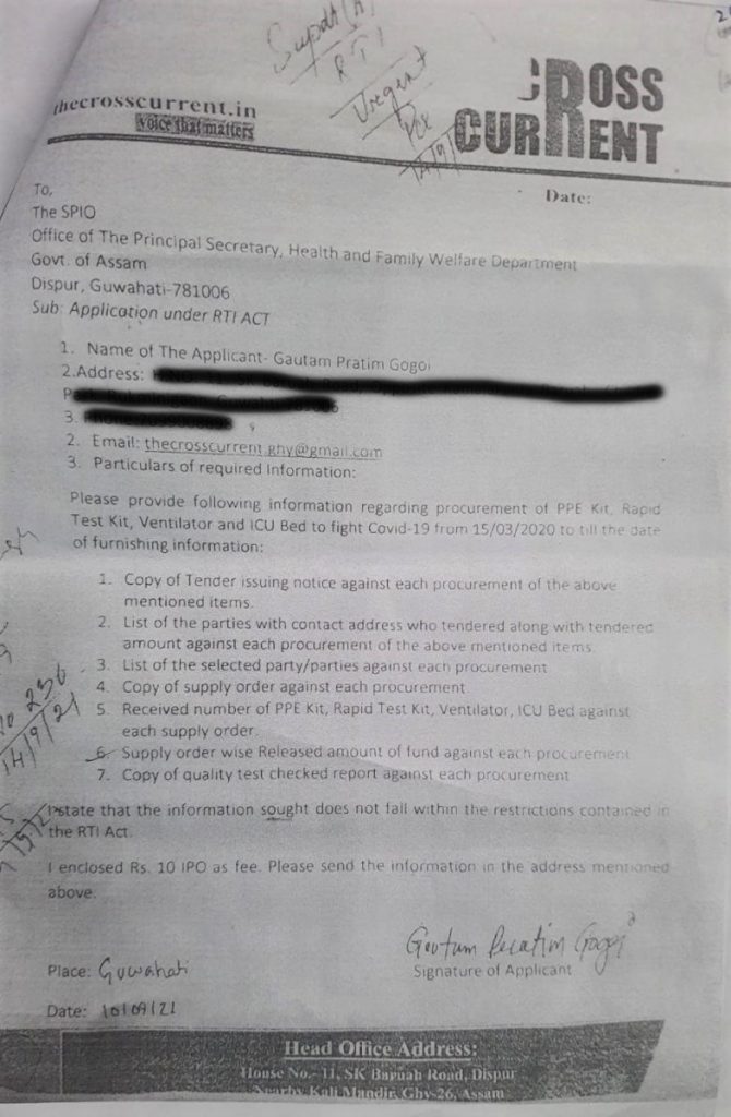The RTI application filed by correspondent Gautam Pratim Gogoi of The Cross Current in September 2020.