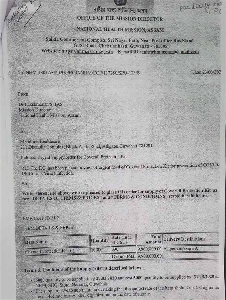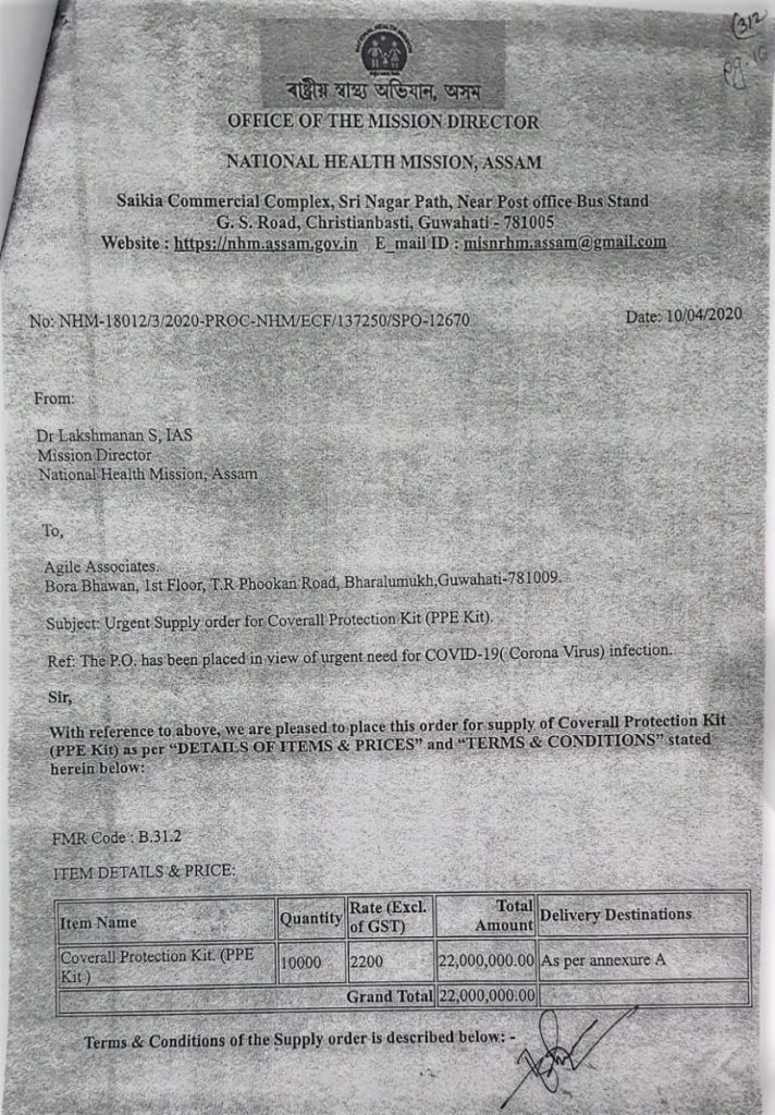 Urgent work order issued to Agile Associates for PPE kits owned by Rajib Bora, a Guwahati-based businessman seen close to Himanta Biswa Sarma.