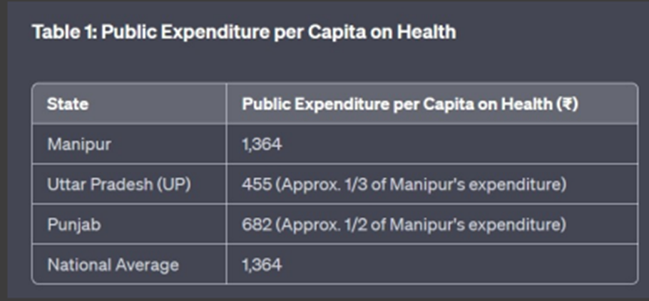 According to the National Family Health Survey (NFHS)-4, 2015-16, Manipur's per capita public health expenditure stands at Rs 1,364. This is almost three times that of Uttar Pradesh and double the expenditure of Punjab and the national average of India.
