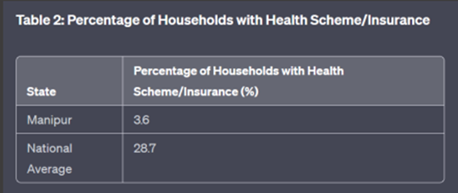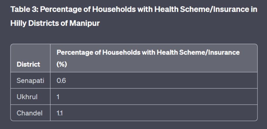 Despite such a high expenditure, the percentage of households with any usual member covered by a health scheme or health insurance is only 3.6%, which is significantly lower than the national average of 28.7%. The coverage is even more limited in the hilly districts, with Senapati, Ukhrul, and Chandel having coverage rates of only 0.6%, 1%, and 1.1%, respectively.