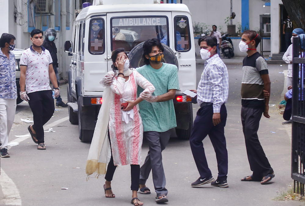 Relatives react after the death of a family member due to COVID-19, as coronavirus cases surge in the national capital, at LNJP hospital in New Delhi, Tuesday, April 20, 2021. Photo: PTI.
