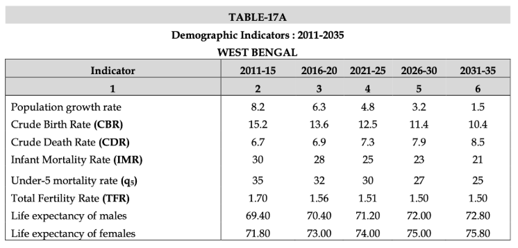 West Bengal’s projected crude death rate is 7.3 per 1,000 (Table 17A) and rises to 7.9 per 1,000 for 2026-30. This translates to expected annual deaths between 6,33,000 and 7.33 lakh for a total projected population of 10.05 crore.