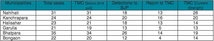The BJP won the majority and took control of municipalities of Nahihati, Kanchrapara, Halisahar, Garulia, Bhatpara, and Bongaon. By taking control over Bhatpara, TMC has regained its majority and formed the board in all the five municipalities.