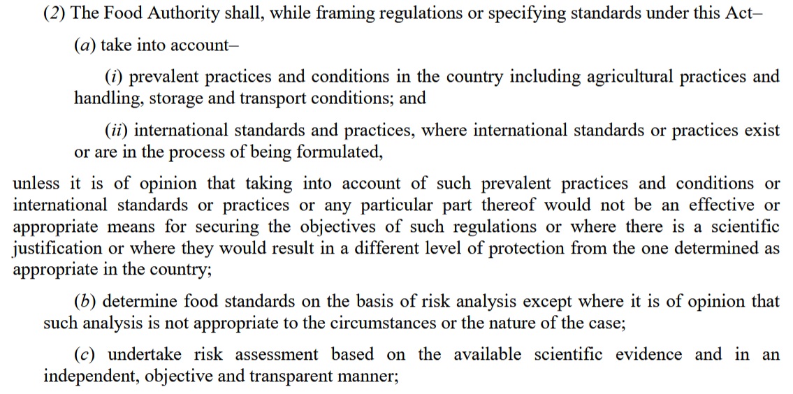 After all, the petitioners’ demand in this case was neither radical nor detached from Indian law. Section 18(2) of the Food Safety and Standards Act, 2006 explicitly requires that food safety standards in India be framed with due regard to international standards and practices where they exist, unless there is a clear scientific justification for deviation or a conscious choice to adopt a different level of protection. This was among the several substantive arguments in the petition.