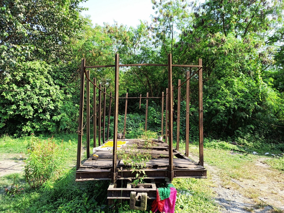 The entire sugar mill complex is in ruins, covered in bushes and hedges. The main gate, Gate No, 1, has been made a tempo stand. The signboard at the gate has rusted and been rendered illegible. There is a small entrance gate next to the main gate where boards of 'No Vacancy’ and 'No Admission' are still distinctly clear.