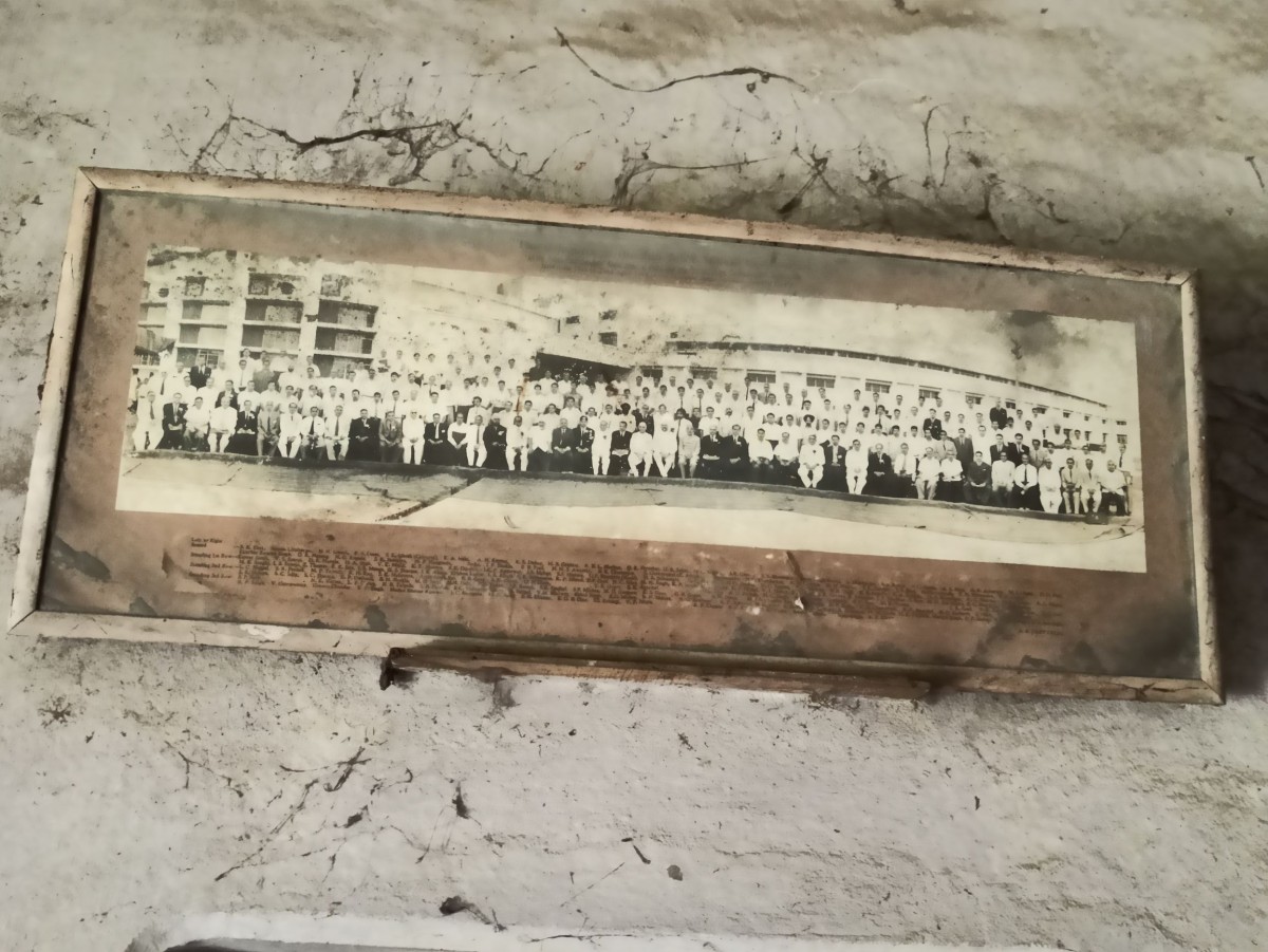 As we proceed into the building, we enter a room with misshapen furniture and a discoloured wall. Two monochrome photographs have been placed on the wall but the captions have faded away. It seems to be a picture of the sugar mill owner, the officers and former employees. Files and pages of books are strewn all over the room.