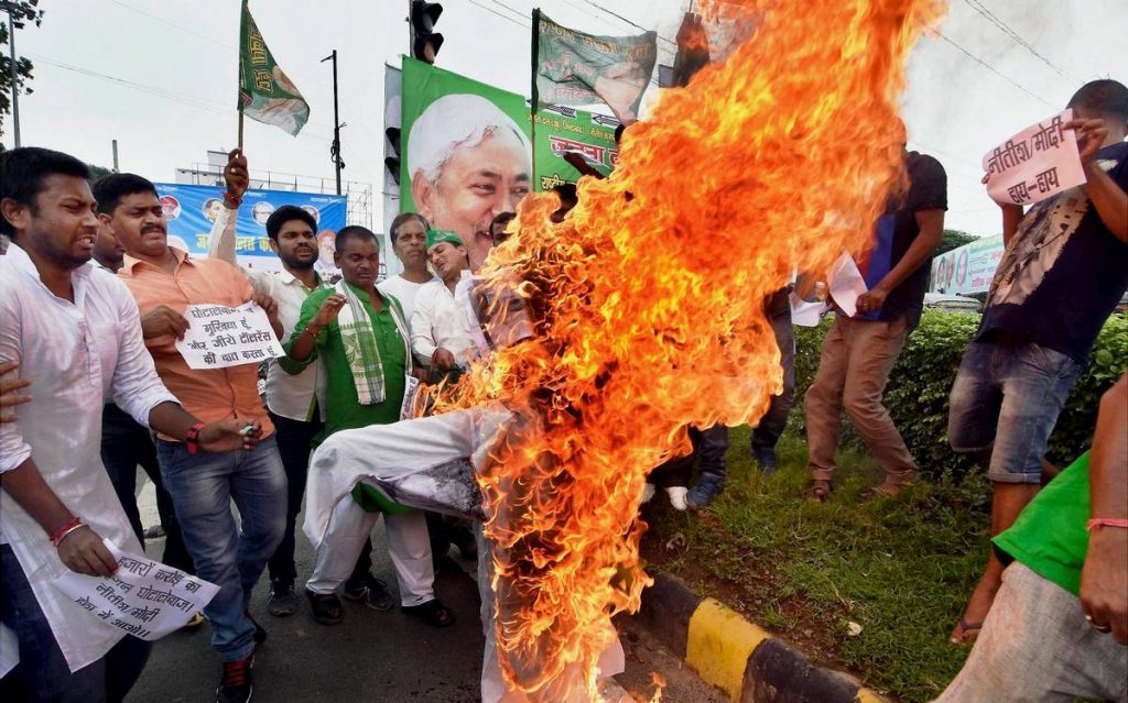 RJD activists burning an effigy of Bihar chief minister Nitish Kumar during a protest. Photo: PTI/File
