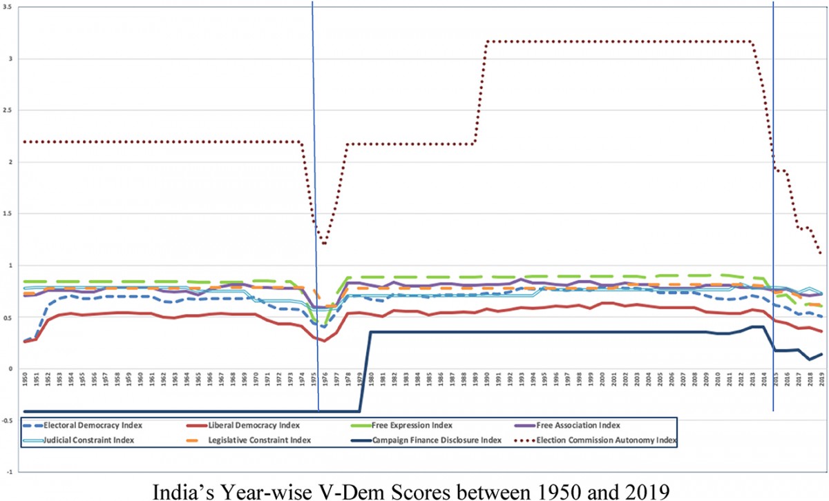 While the V-Dem report clubbed the BJP with ruling parties in Hungary and Poland, Khaitan also finds some key differences. India has had a longer history of democracy and strong institutions, he argues, which is why the first term of the Narendra Modi regime was not enough to sink the country into complete illiberalism.