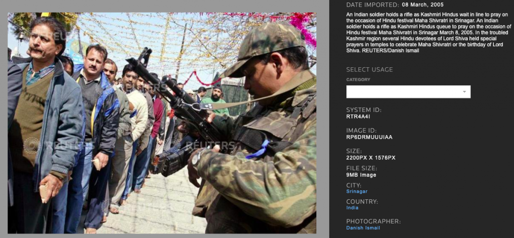 A 2005 picture (below) of the temple available on Reuters Pictures is described as – “Indian soldier holds a rifle as Kashmiri Hindus wait in line to pray on the occasion of Hindu festival Maha Shivratri in Srinagar.”