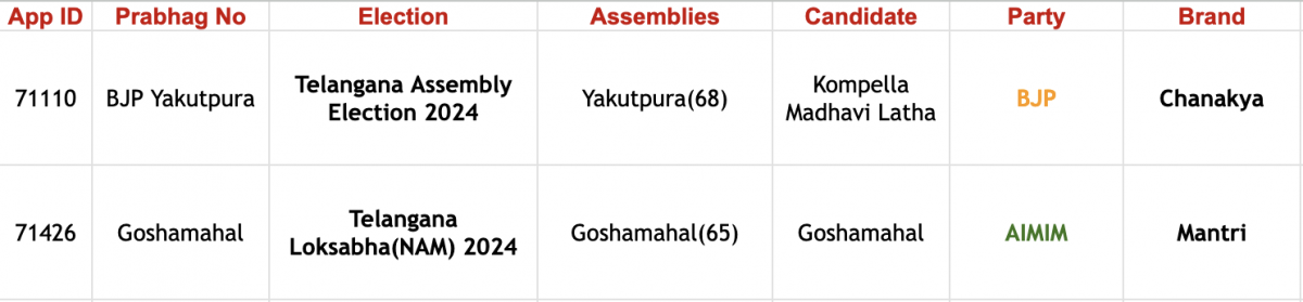 !function(){"use strict";window.addEventListener("message",(function(a){if(void 0!==a.data["datawrapper-height"]){var e=document.querySelectorAll("iframe");for(var t in a.data["datawrapper-height"])for(var r=0;r Candidates across various parties have bought these apps for municipal, state assembly and parliamentary elections. In the recently concluded general elections, candidates of the All India Majlis-e-Ittehadul Muslimeen (AIMIM) and the Bharatiya Janata Party (BJP) in the Hyderabad Lok Sabha constituency bought the same app and voter data under different brand names from different salespeople. The BJP’s Hyderabad Lok Sabha candidate K. Madhavi Latha and other BJP leaders bought this booth app from a salesperson of the “Chanakya” brand, while Asaduddin Owaisi’s AIMIM bought it from a salesperson from “Mantri”. Screengrab from data accessed by The Wire. Note: The ‘Telangana Assembly Election 2024’ refers to the Lok Sabha elections as the state assembly elections were held in 2023. The Wire analysed the data that was being shared through both apps and found that the same voter data and phone numbers were being shared with both candidates. Any information collected by the booth-level agents of various political parties can potentially reach their rival candidates through these data brokers. Screengrab from data accessed by The Wire. Note: The ‘Telangana Assembly Election 2024’ refers to the Lok Sabha elections as the state assembly elections were held in 2023. The data shows that the scale of the operations in claims made on RajMarga’s website are not overstated. Who is behind these apps? A senior salesperson from RajMarga said that these apps have been developed by “young men who are just starting their careers. They have done app development courses and were able to make these ‘rudimentary apps’,” adding that anyone who knows app development can make them. According to information available on e-commerce platform Indiamart, RajYog is a product of Ktechbeans Software Pvt. Ltd. Data from business research platform Zauba Corp shows that Manoj Anand Rao and Vaibhav Varpe were two of four directors at Ktechbeans. These names, along with their contact numbers, also popped up in our database of salespeople who sold these apps. Screengrab from Zauba Corp. While Ktechbeans was dissolved some time around 2019 according to the RajMarga salesperson quoted above, Rao and Varpe are listed as directors of another firm: Leal Consultancy Services or “LCS”. RajMarga’s website says ‘developed by LCS Pvt Ltd’ even though the salesperson denied any links. The LCS website also lists Sanghnayak as one of its products while RajMarga is listed as a client. A Maharashtra-based salesperson contacted by The Wire, Rajesh, who only revealed his first name, referred to “Manoj” as the main engineer who had developed the app. “The team has only made the app, I will give your number [to Manoj],” Rajesh said on being asked if The Wire could speak to the developer or the main engineer behind this app. Manoj said that he, along with the 'voter app team', used an OCR tool to process the data on the EC's website and made it available through their app. OCR stands for Optical Character Recognition. It is a technology that recognises text within a digital image and is commonly used to recognise text in scanned documents and images. "We process the data from the PDF available on EC's website," he said. However, Manoj was not able to explain how they had access to phone numbers in the excel file that the apps were accessing as the EC does not provide voters' phone numbers. Screengrabs from different booth management apps. Photo: Srinivas Kodali/The Wire The other director, Vaibhav Varpe, denied working with any apps in the recent elections and said he had not found “much use” of these apps in the electoral process. His LinkedIn profile lists him as the founder of LCS. Beyond these companies, The Wire found logos of a few different companies on voterapp.in. These companies were also mentioned on LCS’s website as clients along with Rajmarga. The companies include NinthMotion, DooGraphics, MindTech Services and Blossom Publications India Limited. The Wire was not able to determine if these companies are involved with booth management apps beyond their mention on voterapp.in. The websites for RajMarga and voterapp.in – the domain where all the apps were primarily communicating – were pulled down shortly after The Wire contacted them for this story. In addition to these, we found that Mantri is marketed by Apps Techno Private Limited. While we were not able to trace the source companies of each brand, all of them appear connected to each other. The salesperson from RajMarga said: “All these apps are my competitors. Maybe the developer has used a multi-branding strategy to sell these apps”, when asked how a single database could contain information for ‘competing’ apps. Also read: The Mystery Behind Voter Slips With Party Symbols: Data Brokers and Booth Management Apps Most of these companies operate from Pune with the exception of DigiFace, which is based in Hyderabad. Some salespeople The Wire contacted denied knowing who had built these apps. The salesperson from RajMarga said: “We deal with election management. We enlist the services of the companies who make these apps based on what the candidate requires. We are basically a channel. Say you are the company selling it to us for Rs 100, so we sell it forward for Rs 105. It is not a big operation.” He explained that since those who have developed the app cannot reach all candidates on their own, they use “mediums” like RajMarga to sell their app. “App development is a separate process, and channelising it is separate. Who will take the app to the market? We are just a distribution medium,” he claimed. The Wire sent a detailed questionnaire about the app and how voter data privacy is ensured to RajMarga 