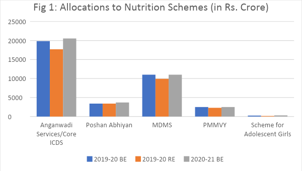 Looking at the budget allocations for these schemes in comparison to last year, it is seen that there is no sizeable increase for any of these schemes. In fact, compared to the BE figures of 2019-20 assuming an average inflation of 4.5%, in real terms there is a slight decline in the budget allocated for anganwadi services, mid-day meals and PMMVY. However, compared to the revised estimates for last year, an increase is seen, the highest being 28% increase for anganwadi services.