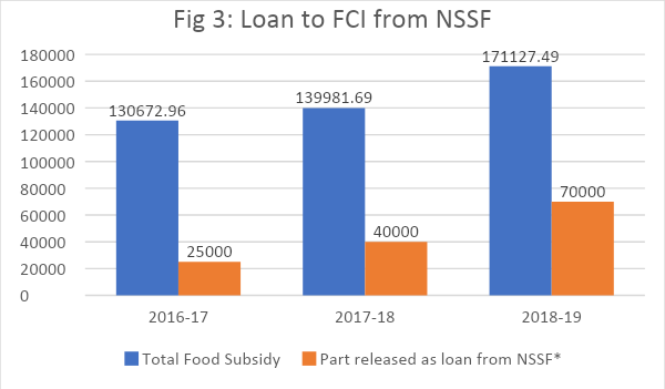 This indicates two things – first, the government is planning to continue to bleed the FCI by not paying up the entire subsidy amount. As it has been doing over the past few years where it is transferring a part of the food subsidy in the form of loans from the National Small Savings Fund (NSSF) (see figure 3 below). This only increases the interest burden in the long run while in the short term allows the government to get away with showing a lower expenditure burden and therefore a smaller fiscal deficit.