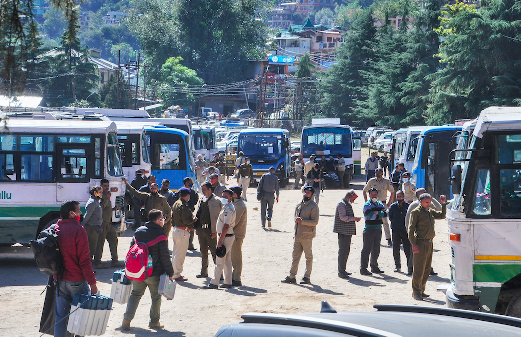Polling parties leave for poll duty ahead of the bypoll to Mandi Lok Sabha seat, in Kullu, Thursday, Oct. 28, 2021. Photo: PTI