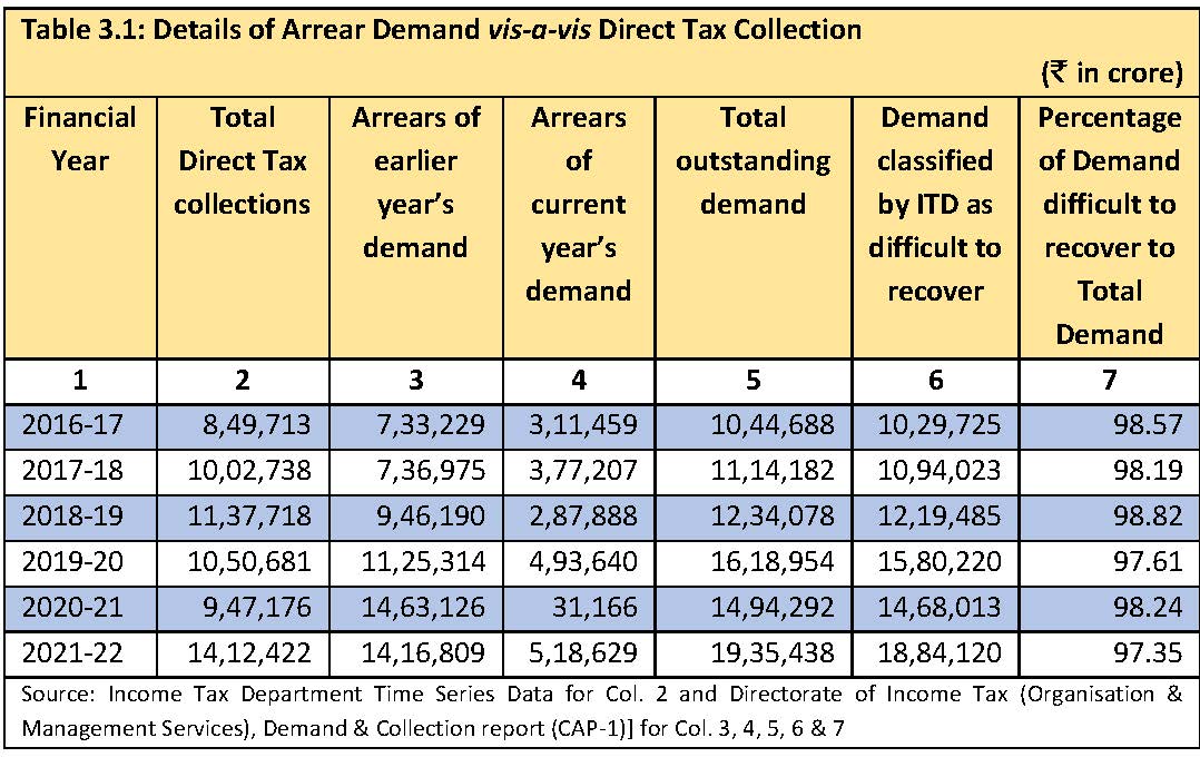 - Non-fixation of targets for cash collection: The CAG observed that the CBDT had set annual targets for cash collection only until 2016–17 but began setting targets for reducing arrear demand from 2017–18 onwards. So, from that year up to 2019-20, CBDT fixed the target for reduction in arrear demand at a uniform rate of 40% across all regions. However, the CAG found that no target was fixed for reduction of outstanding demand for subsequent years and achievements for the years 2019-2021 were not reported to CBDT by the regions. The CAG notes that this was primarily due to the non-reparation of full-fledged central action plans during those years (para 7.3.1, pages 138-144);