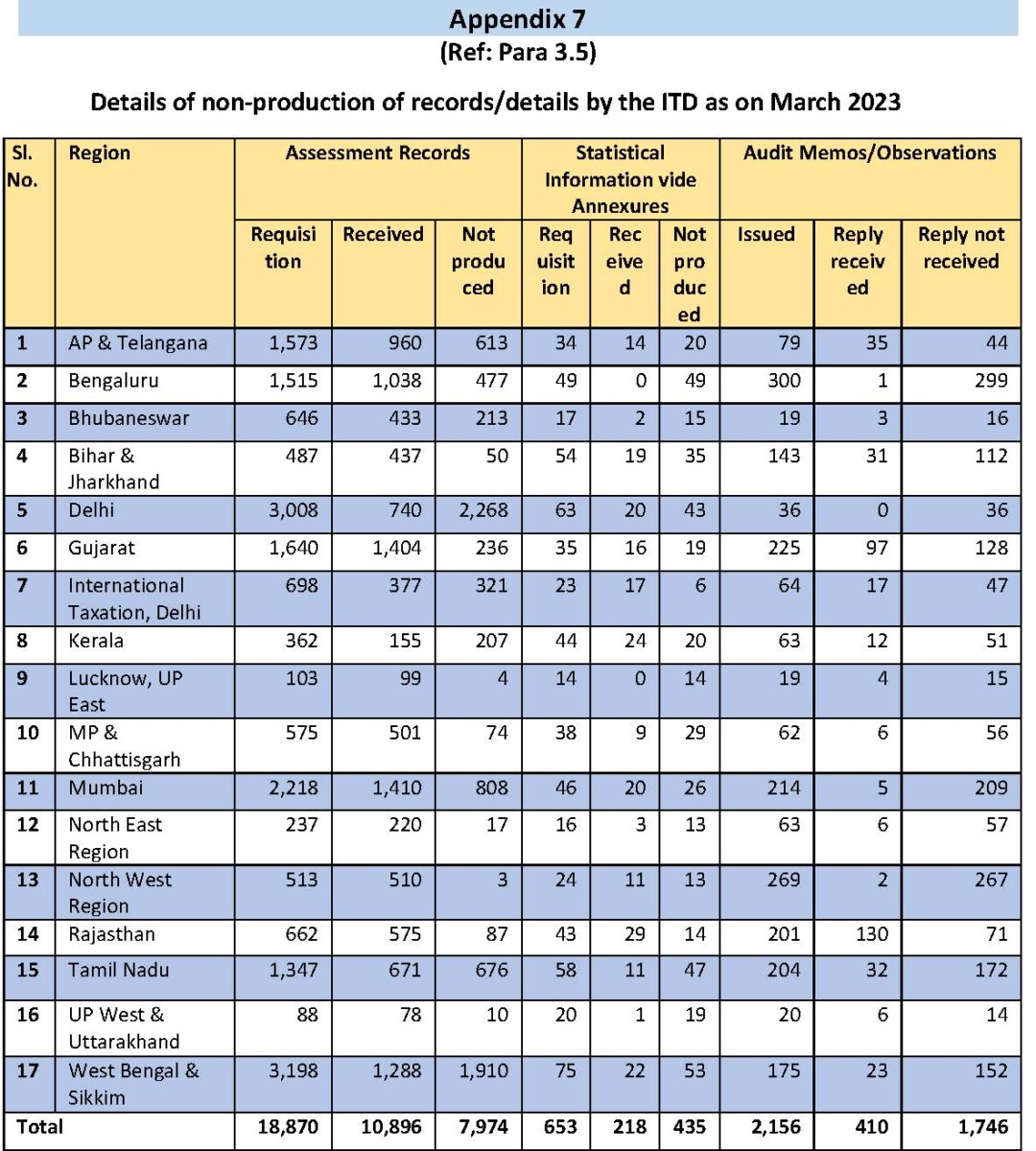 The CAG says it issued 2,156 observations/queries during the audit process but the IT department did not respond to almost 81% (1,746) of them. The region-wise figures for non-production of records/responses by the department presented in Appendix 7 are extracted from the CAG’s report below: