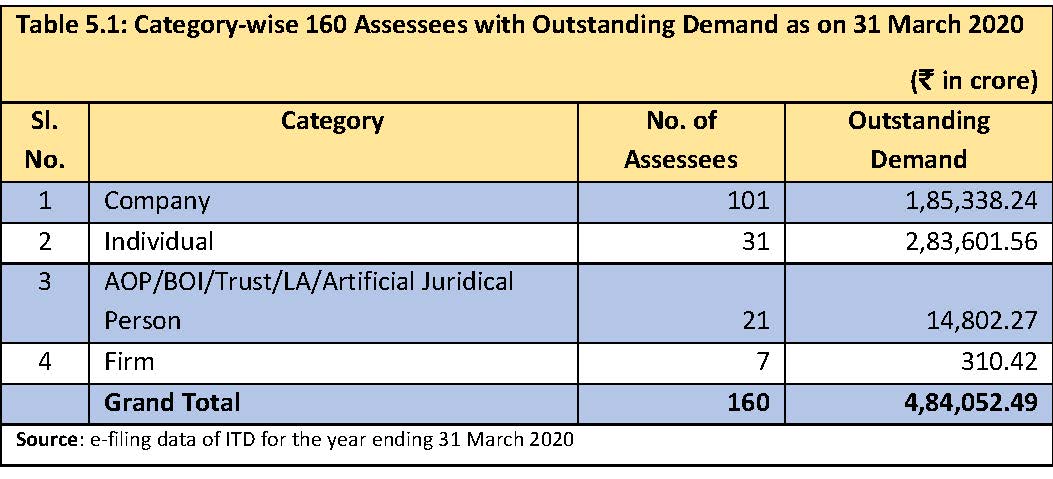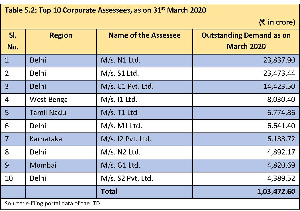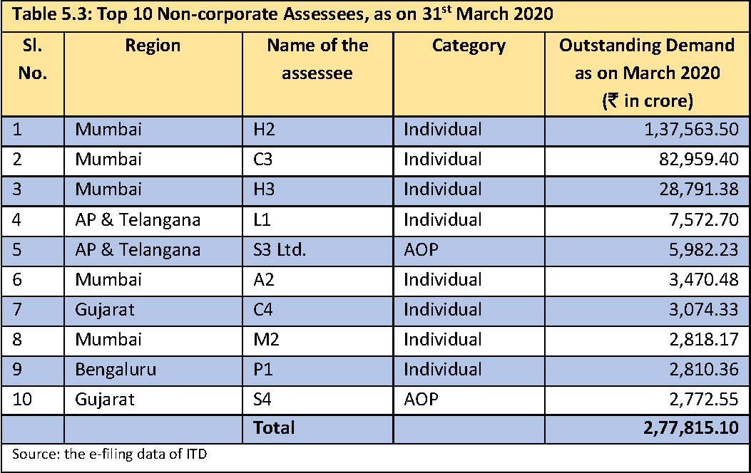 - Out of the 59 non-corporate assesses, 50% of the top ten assessees are Mumbai-based individuals aggregating an outstanding demand of almost Rs 2.56 lakh crores (para 5.2.2, pages 37-38).