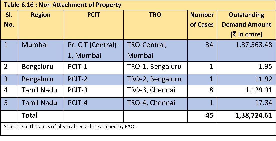The CAG noted that cases which it scrutinised revealed either non-attachment of property, or no further action taken to recover the amount after attachment of property, in 45 cases where the total outstanding demand was Rs 1.38 lakh crore. Region-wise details of such cases extracted from the CAG’s report are reproduced below (para 6.3.5, pages 114-116):