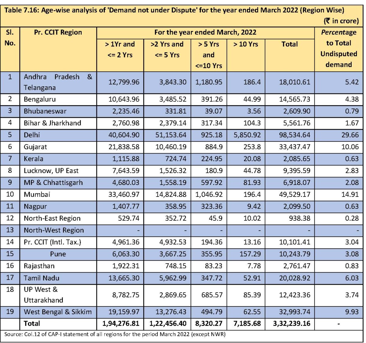 The region-wise data table indicating the length of time for which the IT department had let the undisputed demand amounts go unrealised is extracted from the CAG’s report and reproduced below (para 7.4, page 156):