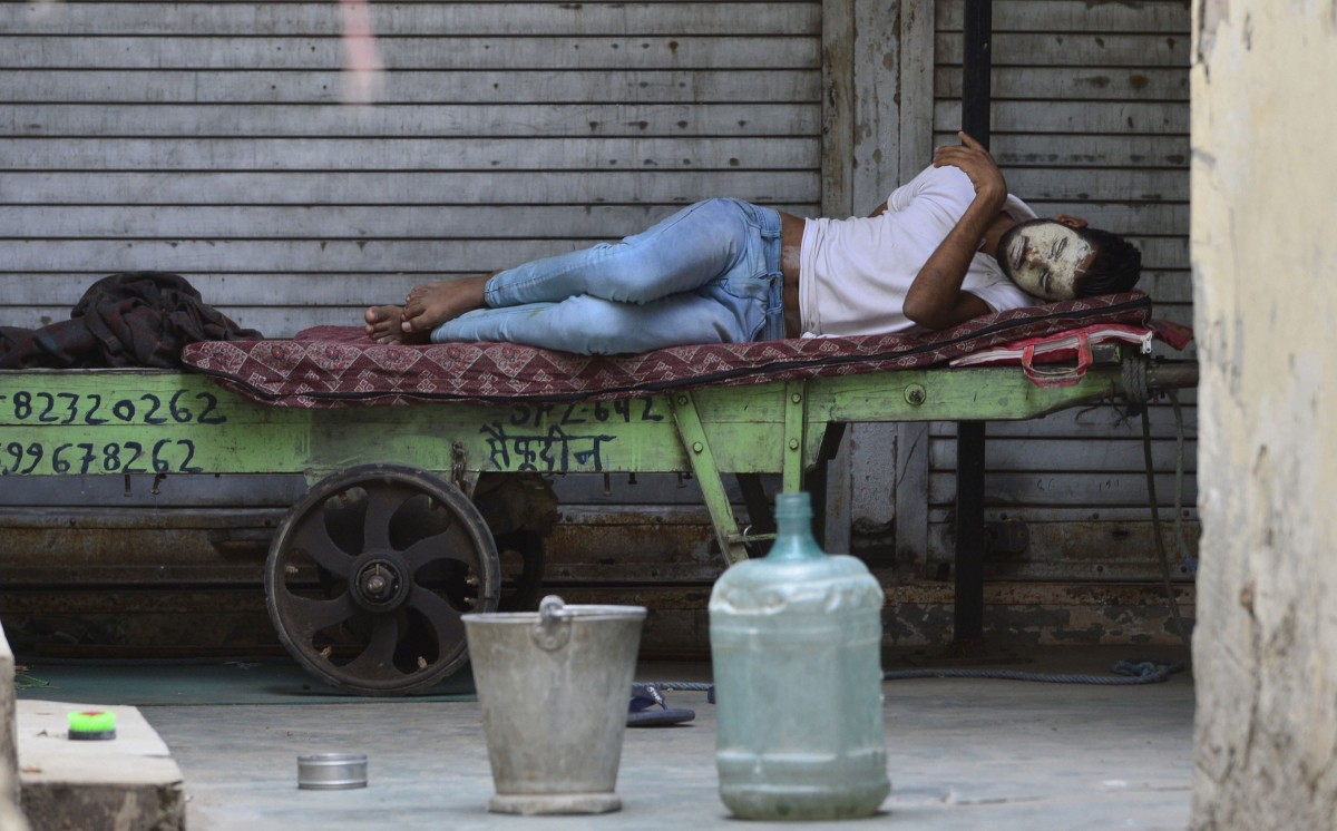 New Delhi: A man sleeps on his cart outside a closed shop during the national lockdown. Photo: PTI/Kamal Kishore