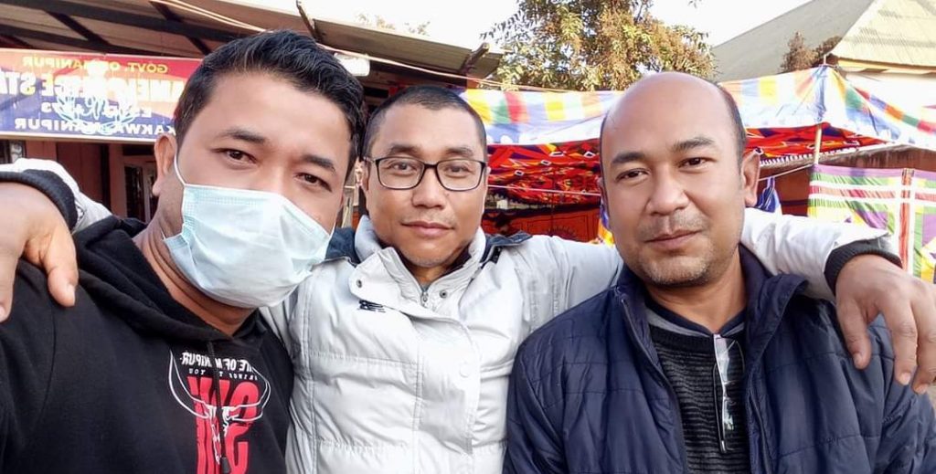 Paojel Chaoba and Dhiren Sadokpam of the Frontier Manipur with journalist Kishorechandra Wangkgem after their release from detention in Imphal. Photo courtesy: Kishorechandra Wangkhem