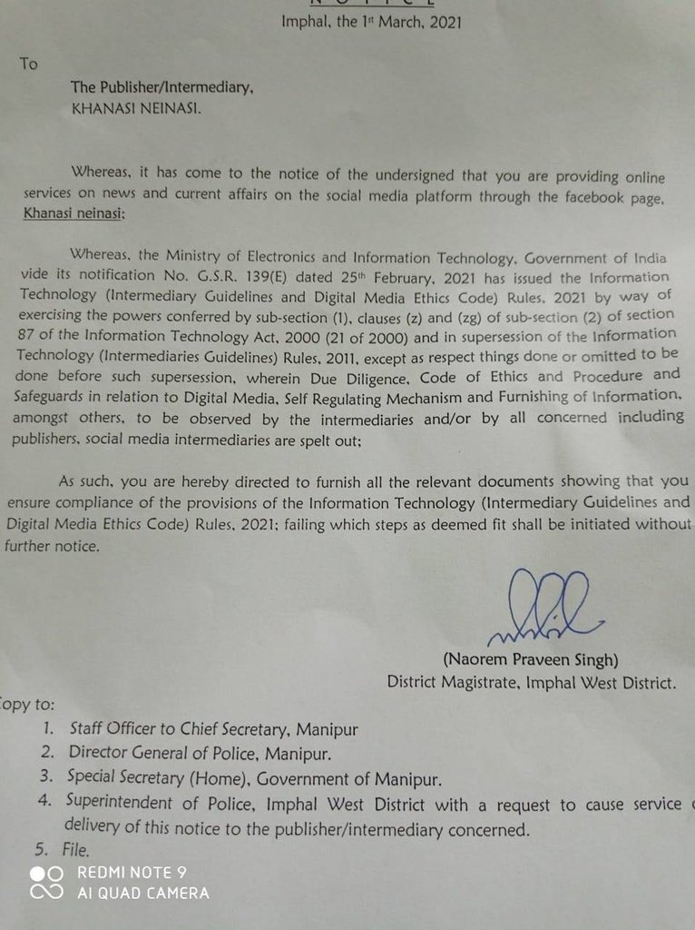 Addressed to the “publisher/intermediary” of ‘Khanasi Neinasi’, it said that since they have been “providing online services on news and current affairs on the social media platform through the Facebook page Khanasi Neinasi”, they were "directed" to “furnish all the relevant documents showing” that they had ensured compliance of the provisions of the Information Technology (Intermediary Guidelines and Digital Media Ethics Code) Rules, 2021, “failing which steps as deemed fit shall be initiated without further notice.”
