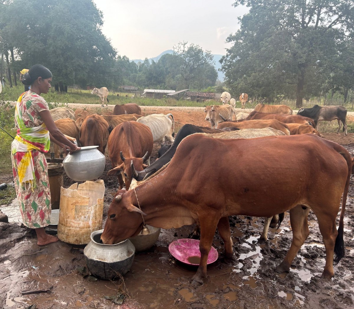 Clean fresh water flows from the pipe. Villagers take baths and collect water. The cattle drink water from the vessels which have already been filled.