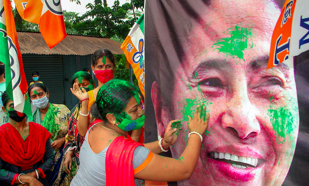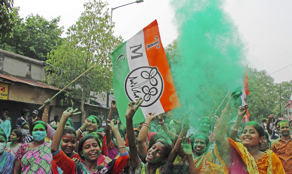 TMC supporters celebrate at Bolpur in the Birbhum district of West Bengal on May 2, 2021. Photo: PTI