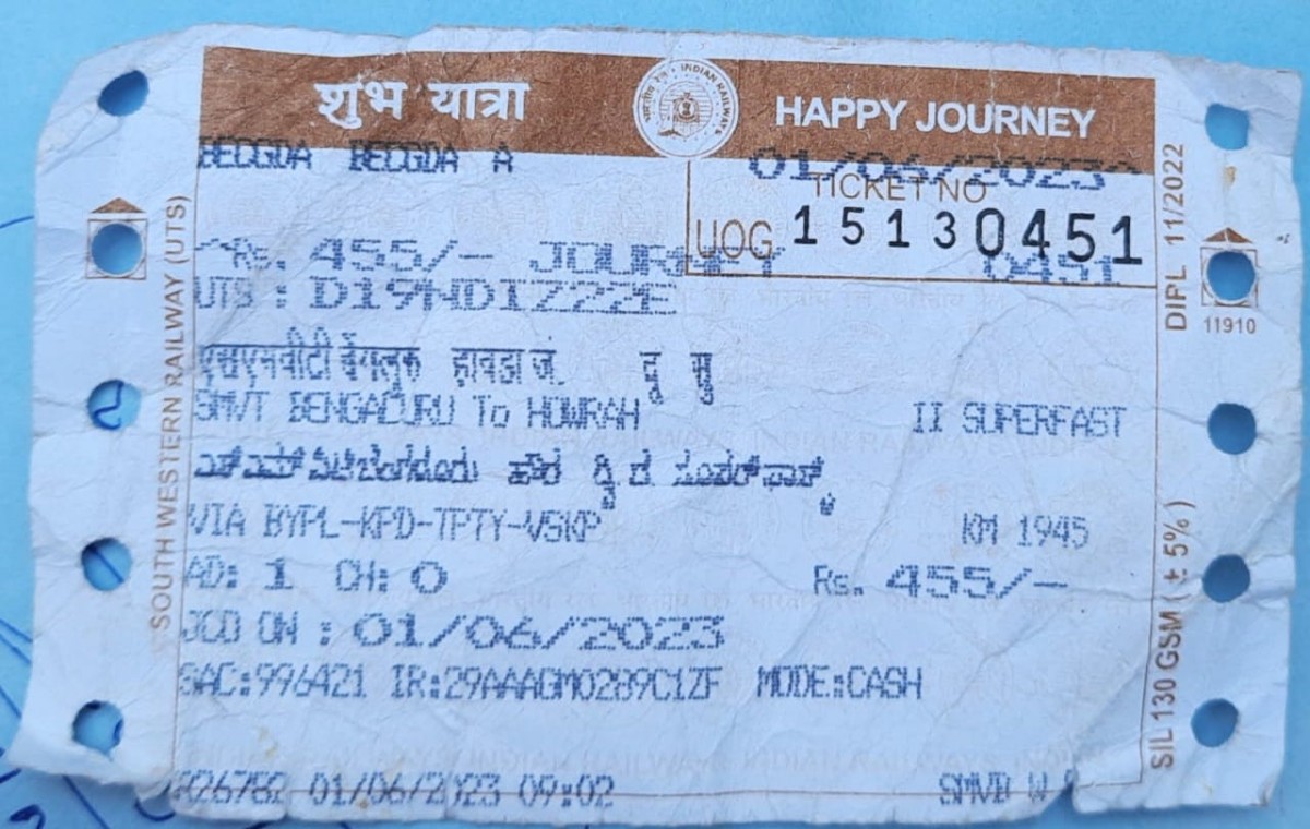 The ticket from Bengaluru to Howrah. Photo: Aparna Bhattacharya