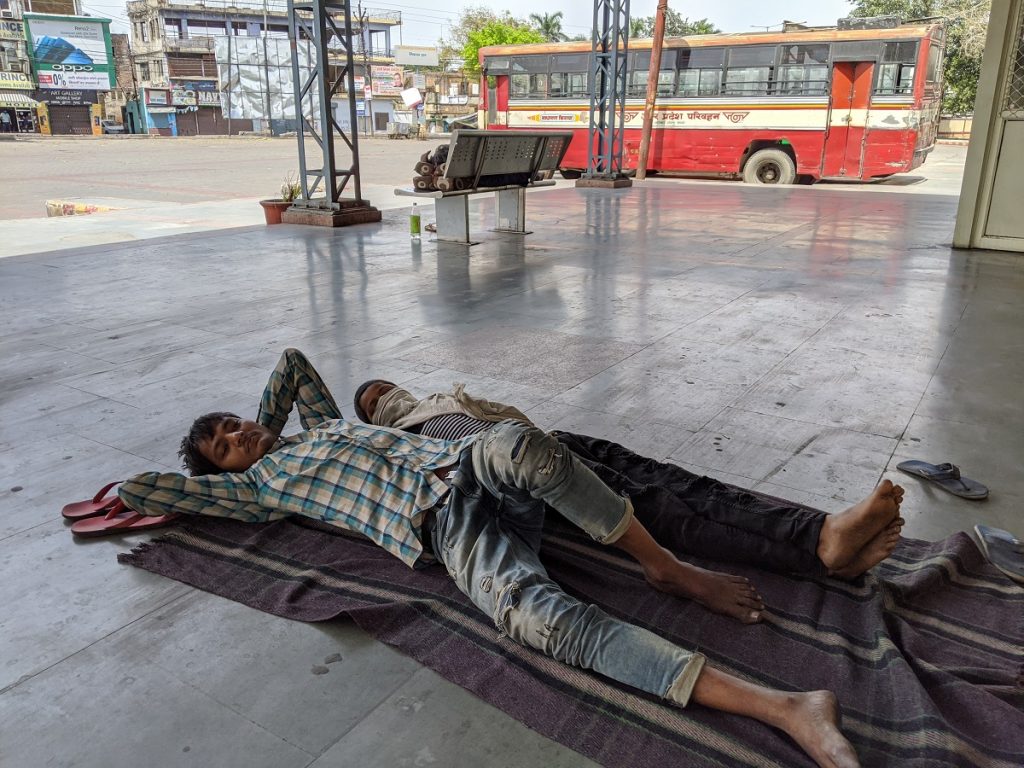 At the bus stand in Meerut, two youngsters, Gaurav (22) and Vishnu (16), lay sleeping on the floor in the late afternoon.