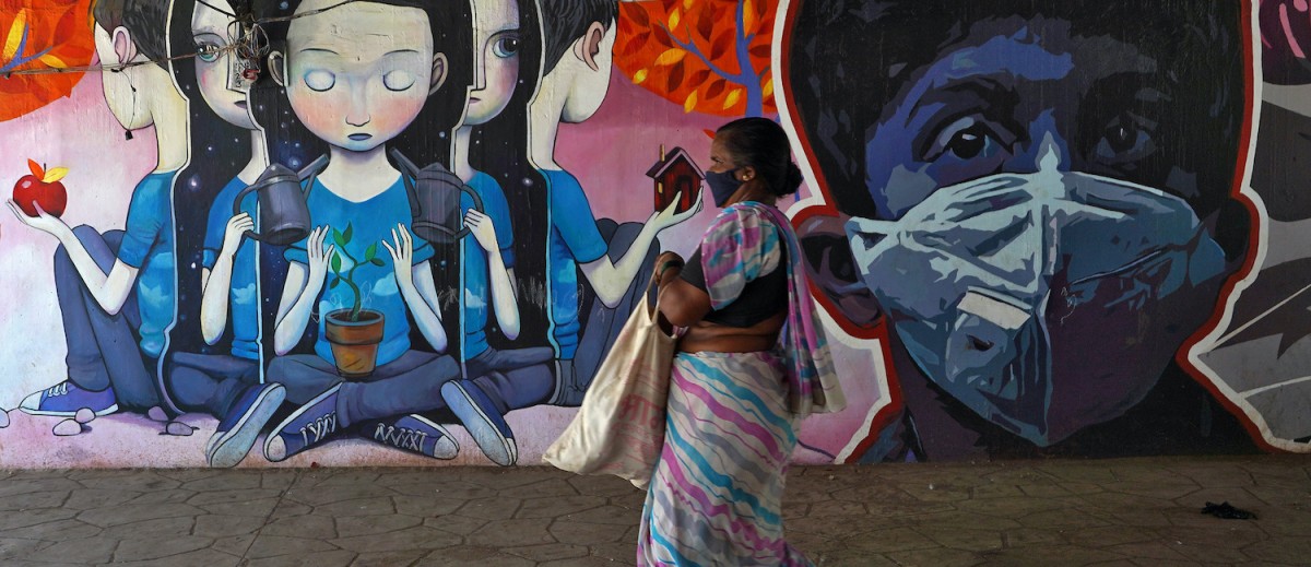 A woman wearing a protective mask walks past a graffiti, in Mumbai, April 2020. Photo: Reuters/Hemanshi Kamani