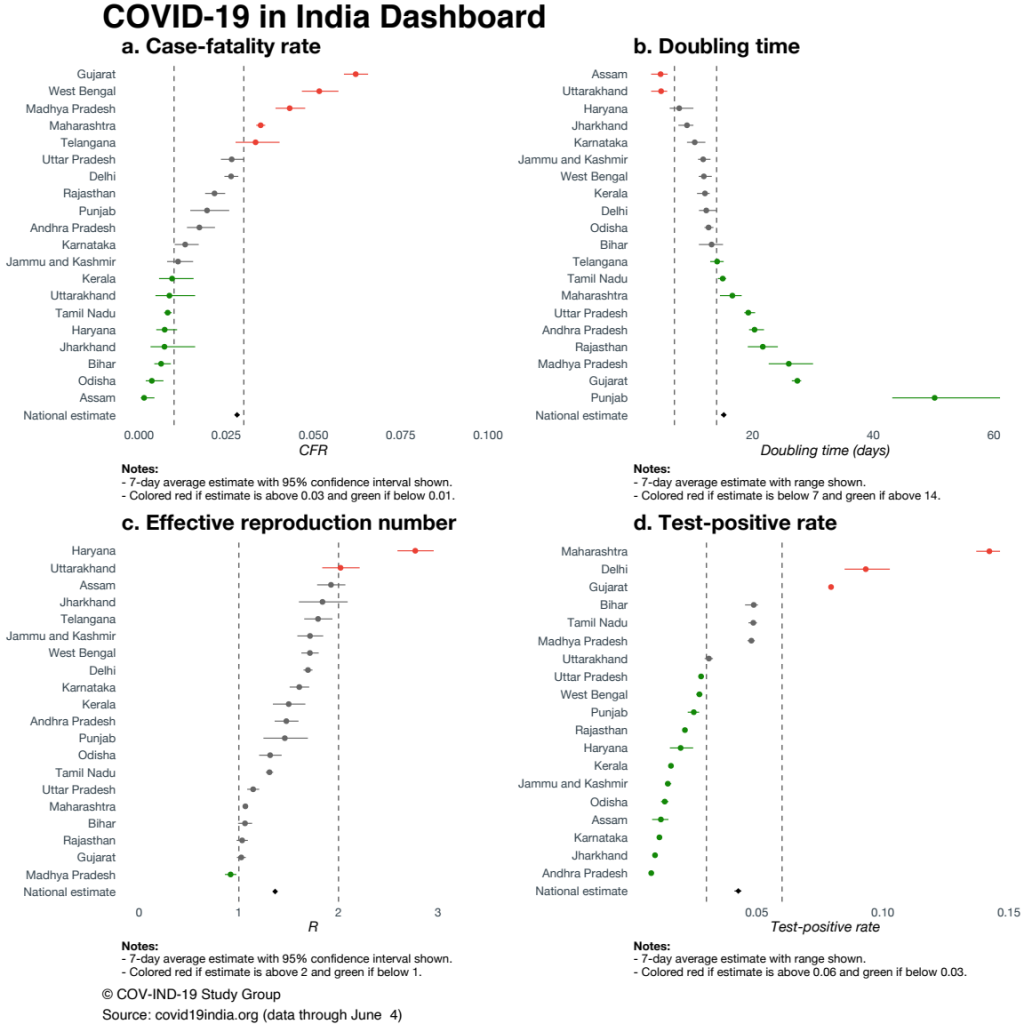 Figure 1: COVID-19 in India Dashboard. (a) Case fatality rate is the number of COVID-19 deaths for every reported case. (b) Doubling time is the number of days it takes for total reported case counts to double. (c) Effective reproduction number is the average number of persons an already-infected person will infect. (d) Test positive rate is the number of positives per test.