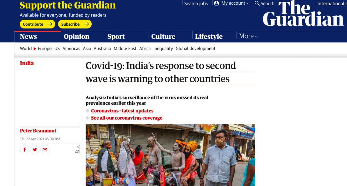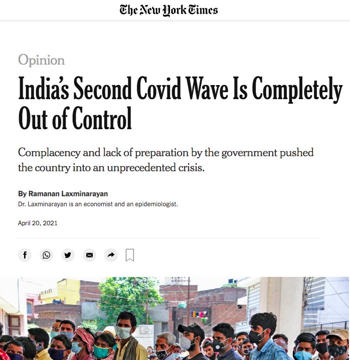 The New York Times, in addition to daily reports in its international edition on the spiralling crisis in India, ran an opinions piece by economist and epidemiologist Ramanan Laxminarayan on how 'India’s Second Covid Wave Is Completely Out of Control.'