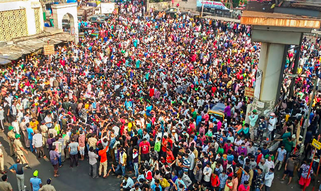 Migrant workers gather outside Bandra West Railway Station. Photo: PTI