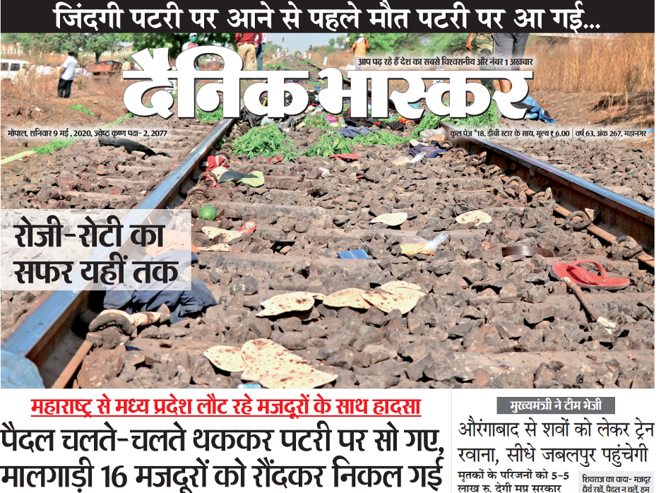 “Death before life could get back on track: the journey of survival ends here. Migrants tired from walking slept on the train track, freight train crushed 16 of them.” Dainik Bhaskar (Bhopal), May 9.