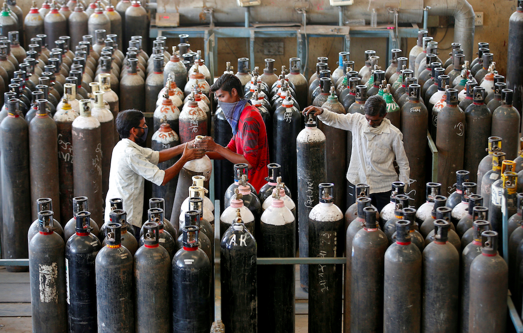 People carry oxygen cylinders after refilling them in a factory, amidst the spread of the coronavirus disease (COVID-19) in Ahmedabad, India, April 25, 2021. Photo: Reuters/Amit Dave